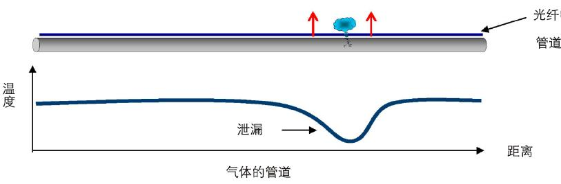 油氣管道泄漏時會引起泄漏點周圍溫度的變化,通過分布式光纖溫度傳感系統可以準確定位泄漏點。在天然氣管線介質泄漏受壓情況下,氣態物質導致的泄漏點的低溫,是由物質的物理性質、工藝條件和周圍環境所決定的。這些點的溫度異常可通過分布式溫度測量而獲得,并有很好的溫度、距離和反應時間精度。管道本身發生泄漏事故時,泄漏出的天然氣由于存在壓力,會向管道周圍發出噴射狀的氣體。如果能對整條天然氣管道在現有的壓力、流量探測技術基礎上,利用沿管道敷設的通訊光纜,接入分布式光纖測溫傳感主機,就能夠實時探測到泄漏點,并進行泄漏點的定位和報警顯示。