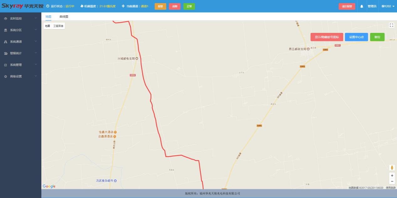 天然氣管線泄漏安全監測系統采用目前先進的管道溫度系統監測技術。僅用天然氣管線中的通訊光纜的一根光纖就可實現長達幾十公里的天然氣管道泄漏定位報警。通過基于通訊光纜的分布式光纖測溫技術,對天然氣管線進行在線溫度分布監測,就能夠通過管道溫度異常點的探測,準確發現管道的泄漏點,并及時的進行報警和定位。如果天然氣管線發生泄漏,高壓氣體的體積膨脹將引起漏點附近溫度的下降,分布式光纖測溫系統同樣可通過溫度異常點的探測,發現并定位天然氣管線的泄漏點。通過對天然氣管線進行在線的分布式溫度監測,并將系統設備接入管道監測系統局域網,通過網絡信號可將溫度信息上傳給中央服務器。可在整個天然氣管線線路發生管道泄漏以及事故初期階段,第一時間發現并報告預警點的具體位置、溫度變化、溫度下降走向等信息數據,為天然氣管線管理部門及其它相關部門及時定位、分析可能發生的管道泄漏事故提供可靠堅實的信息獲取手段,為天然氣管線系統安全運行提供高效的安全保障。本系統具有本質防爆、抗強電磁干擾、電絕緣性好、防雷擊、高精度、重量輕、體積小等優點,適合在易燃、易爆等高危環境應用。設備聯網后,通過載入百度地圖顯示光纜所在位置地圖,并設定中心點,選定當地所在位置,可根據管道的走向在地圖上標出光纜走向圖,當發生報警時,界面會出現一個彈窗,顯示報警地點,報警時間等。